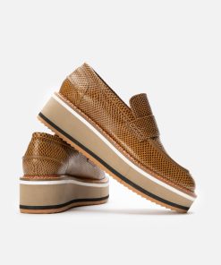 Upper: gobi karung effect embossed calfskin, gobi lambskin / Lining: gold goatskin lining / Sole: amber welt, ceramic EVA flatform, natural sole