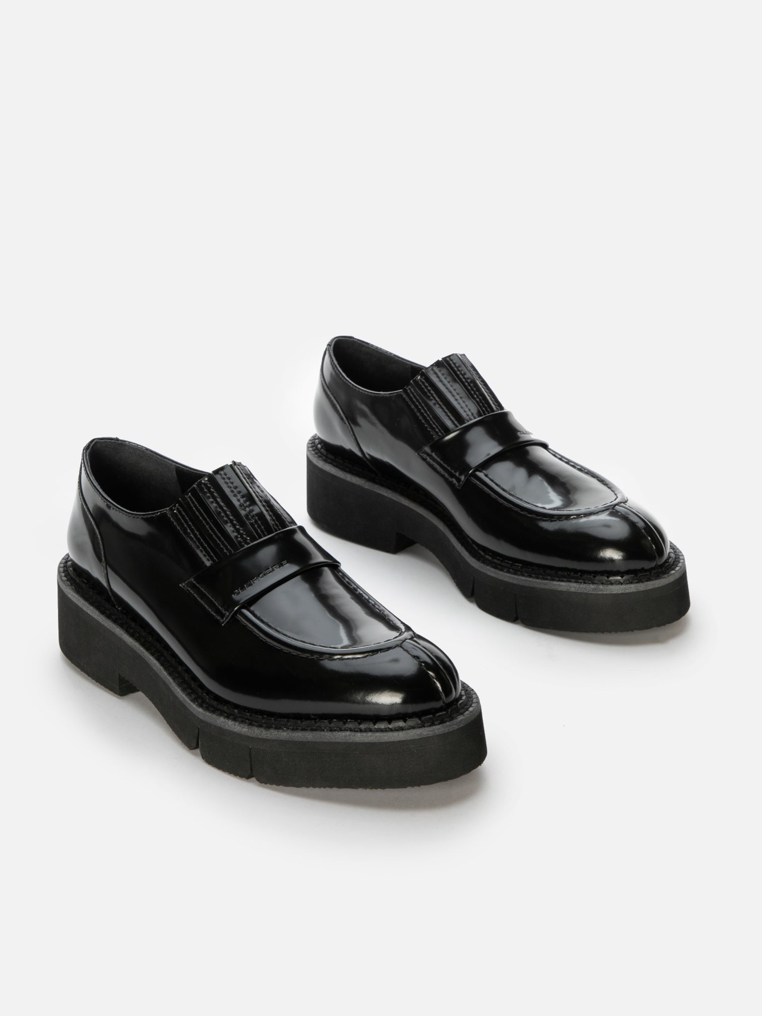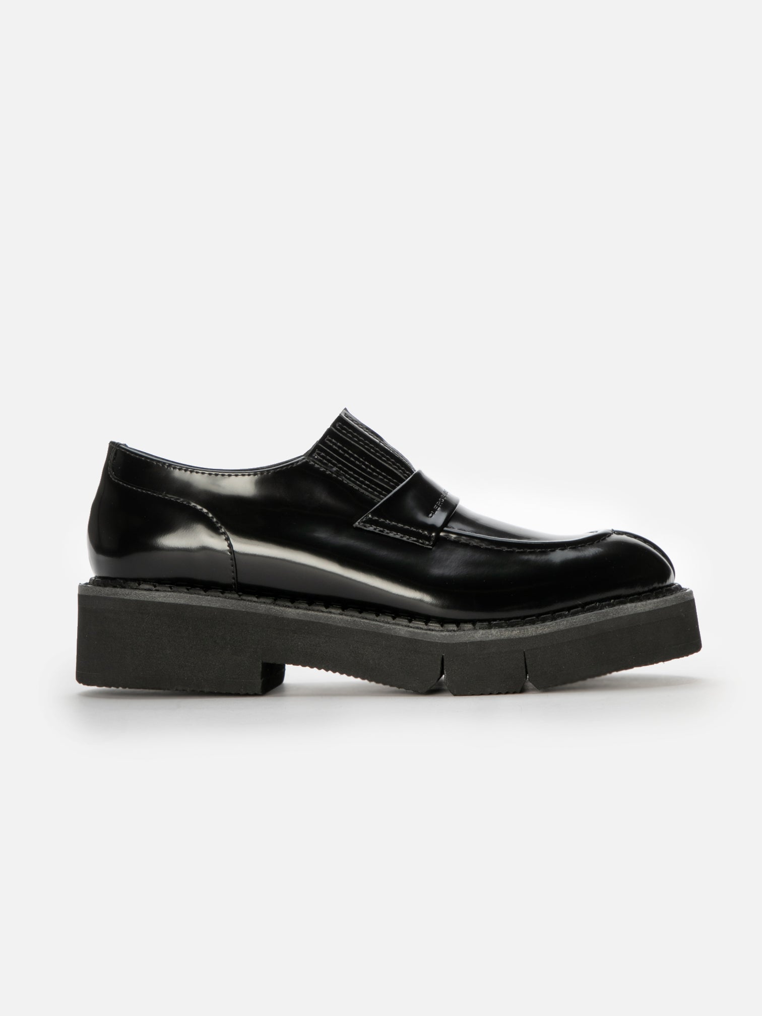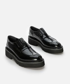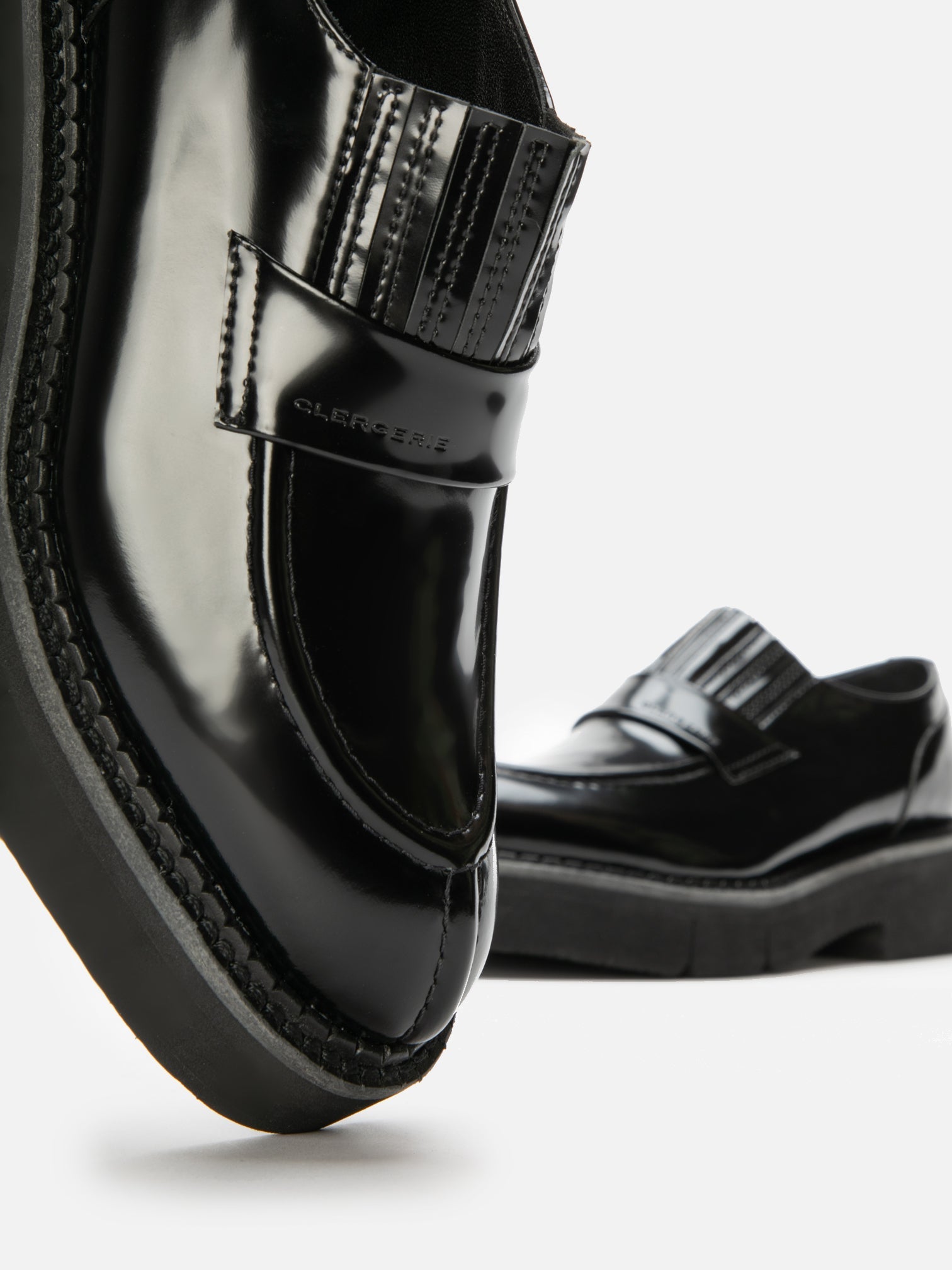 Upper: black glossed calfskin / Lining: black goatskin lining / Sole: black welt, black EVA flatform, anthracite sole