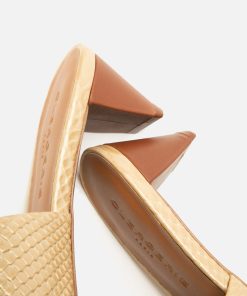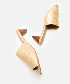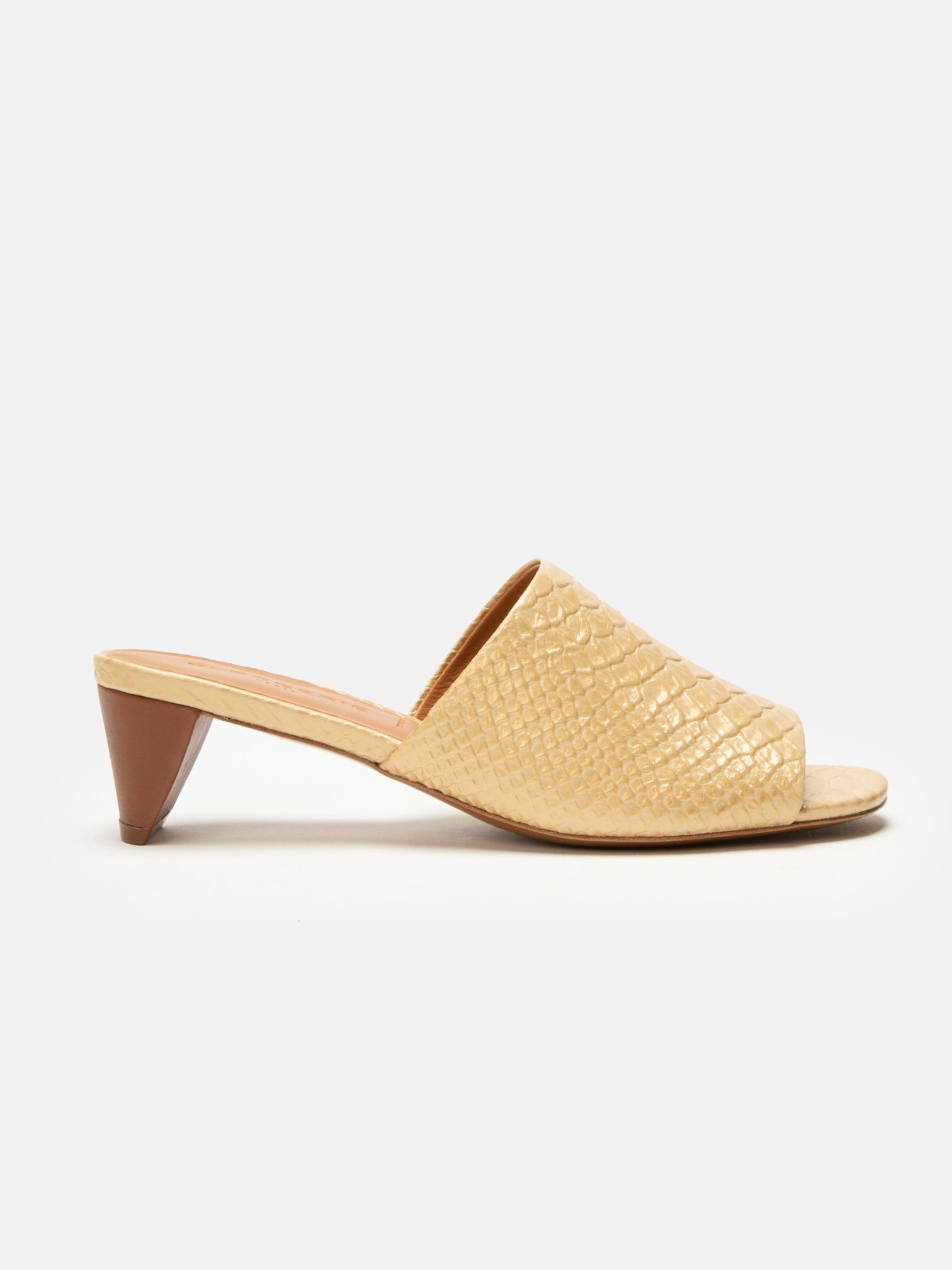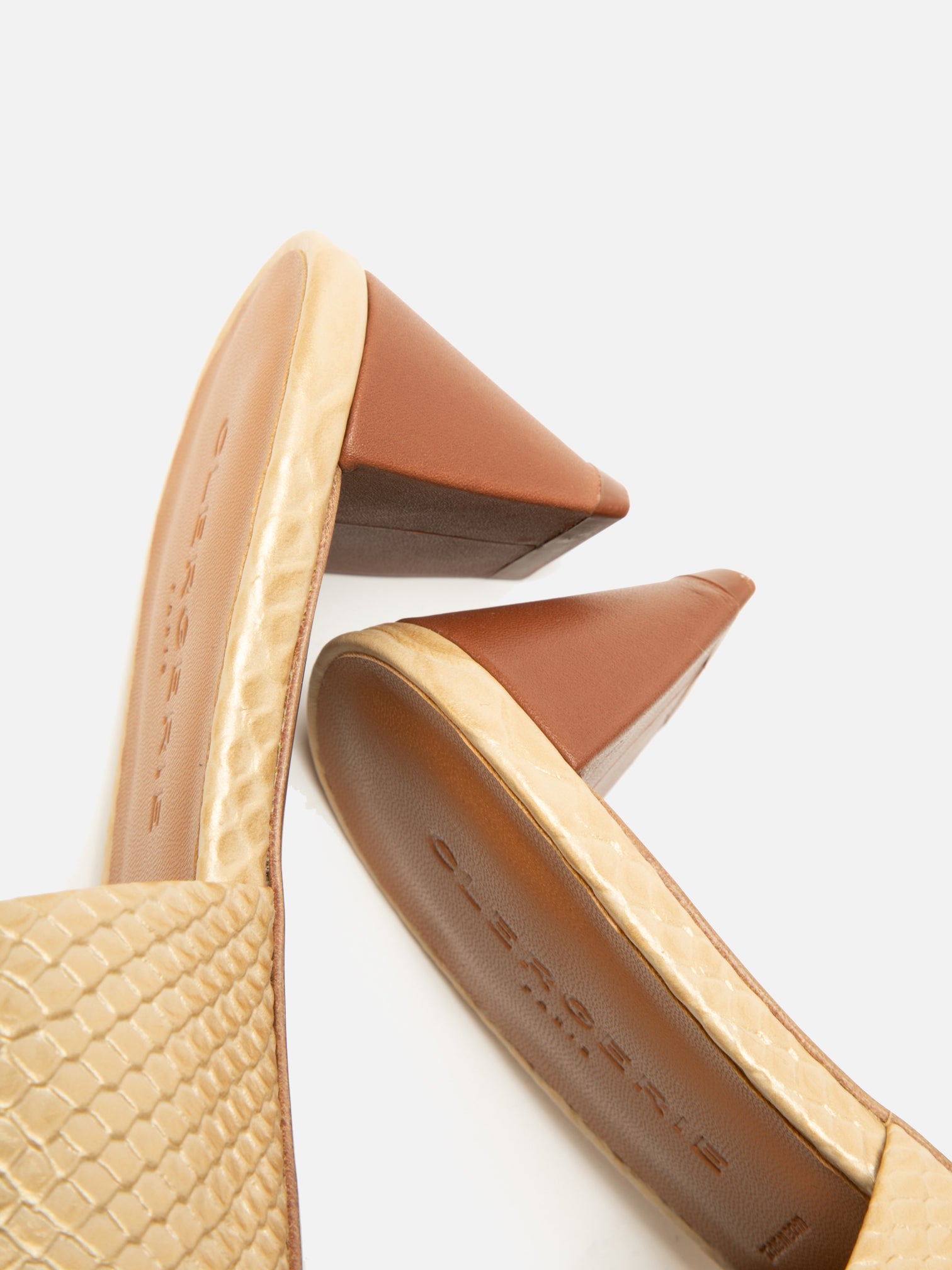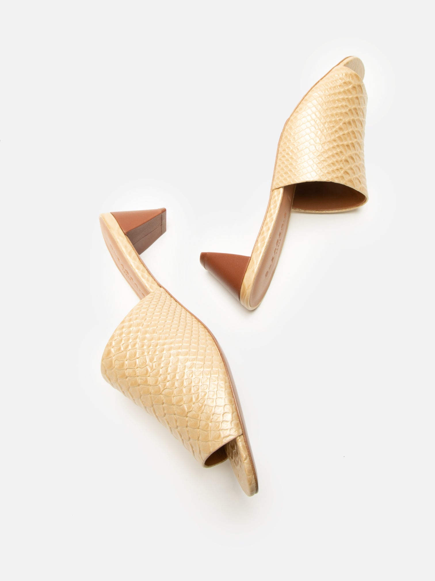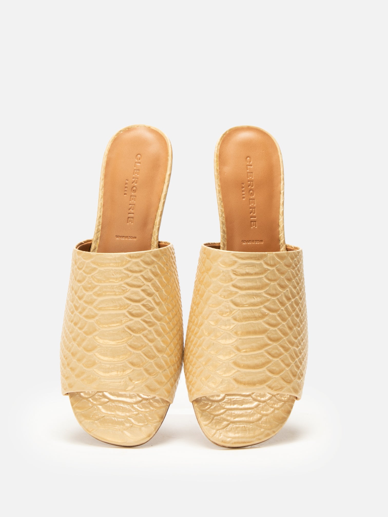 Upper: Nude snake effect iridescent lambskin / Lining: Gold goatskin / Sole: Wood smooth calfskin covered heel, amber leather sole, natural edge
