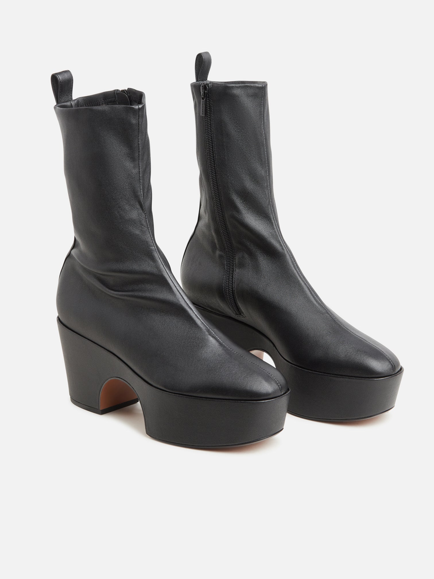 Upper: black stretch lambskin / Lining: black goatskin lining / Sole: black stretch lambskin covered platform, amber leather sole, black edge