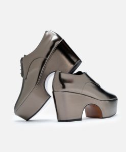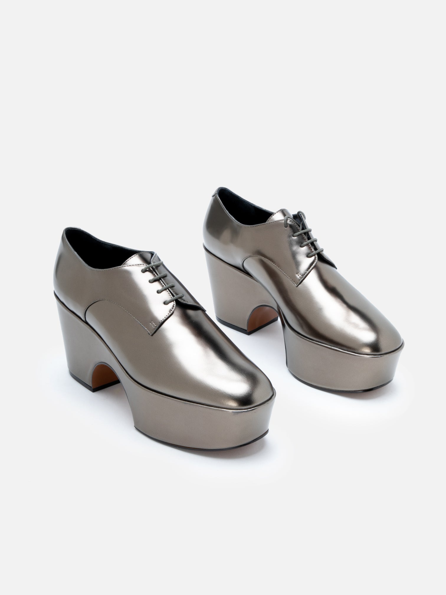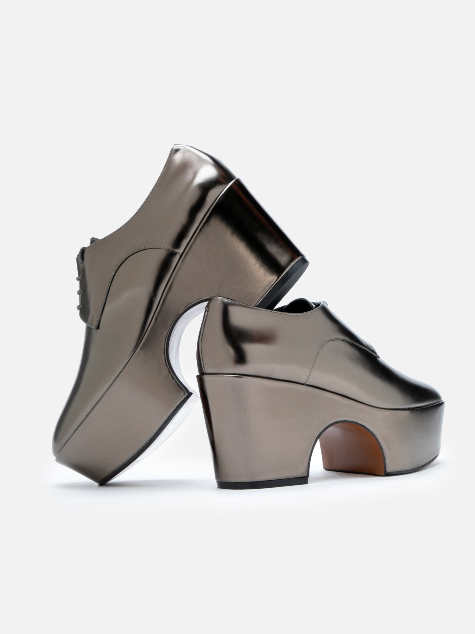 Upper: gobi metallic glossed calfskin / Lining: black goatskin lining / Sole: gobi metallic glossed calfskin covered platform, amber leather sole, black edge