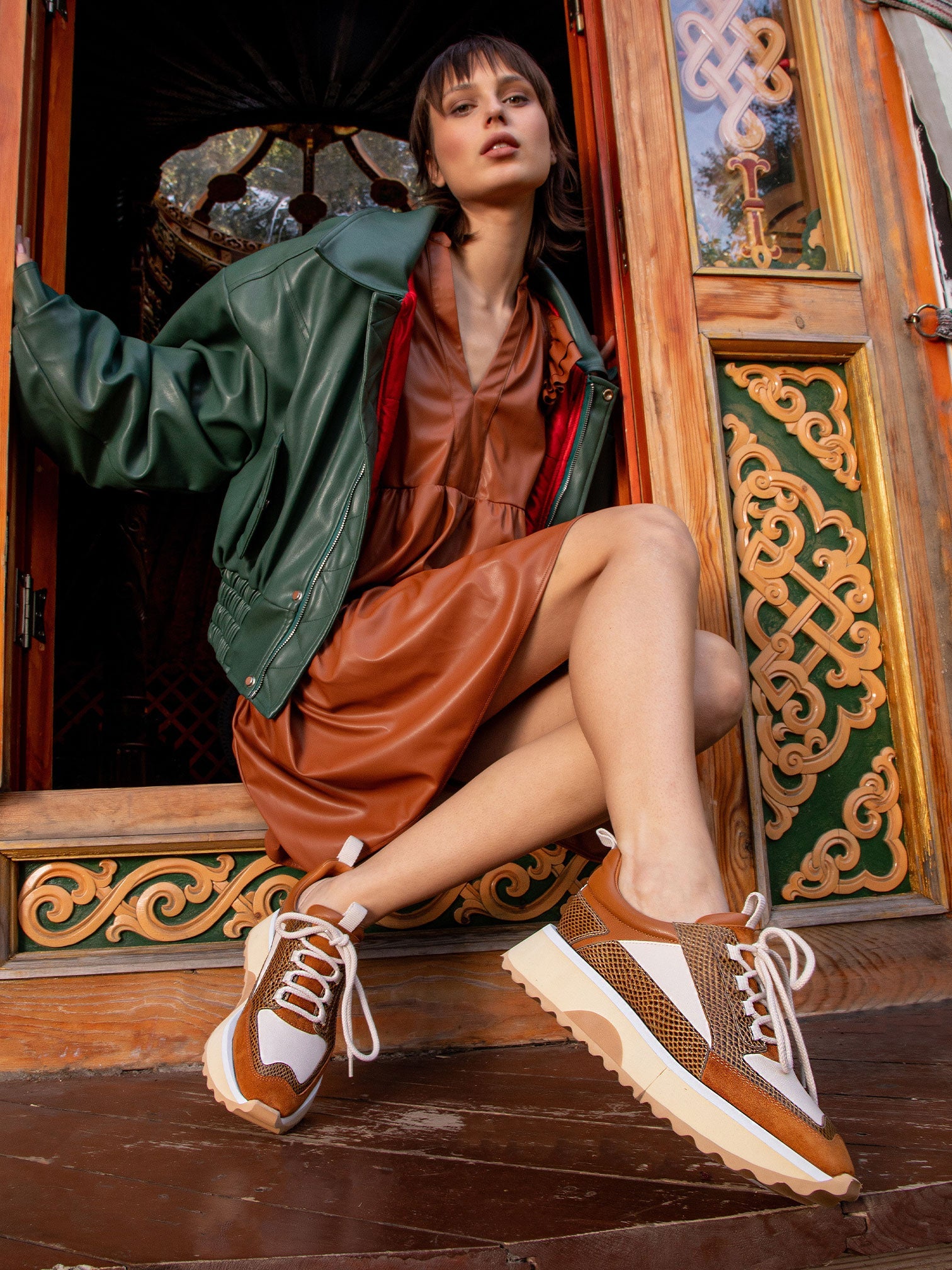 Upper: bush suede goatskin, gobi karung effect embossed calfskin, white lambskin, bush lambskin / Lining: gold lambskin lining / Sole: straw EVA sole