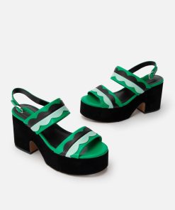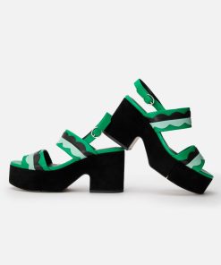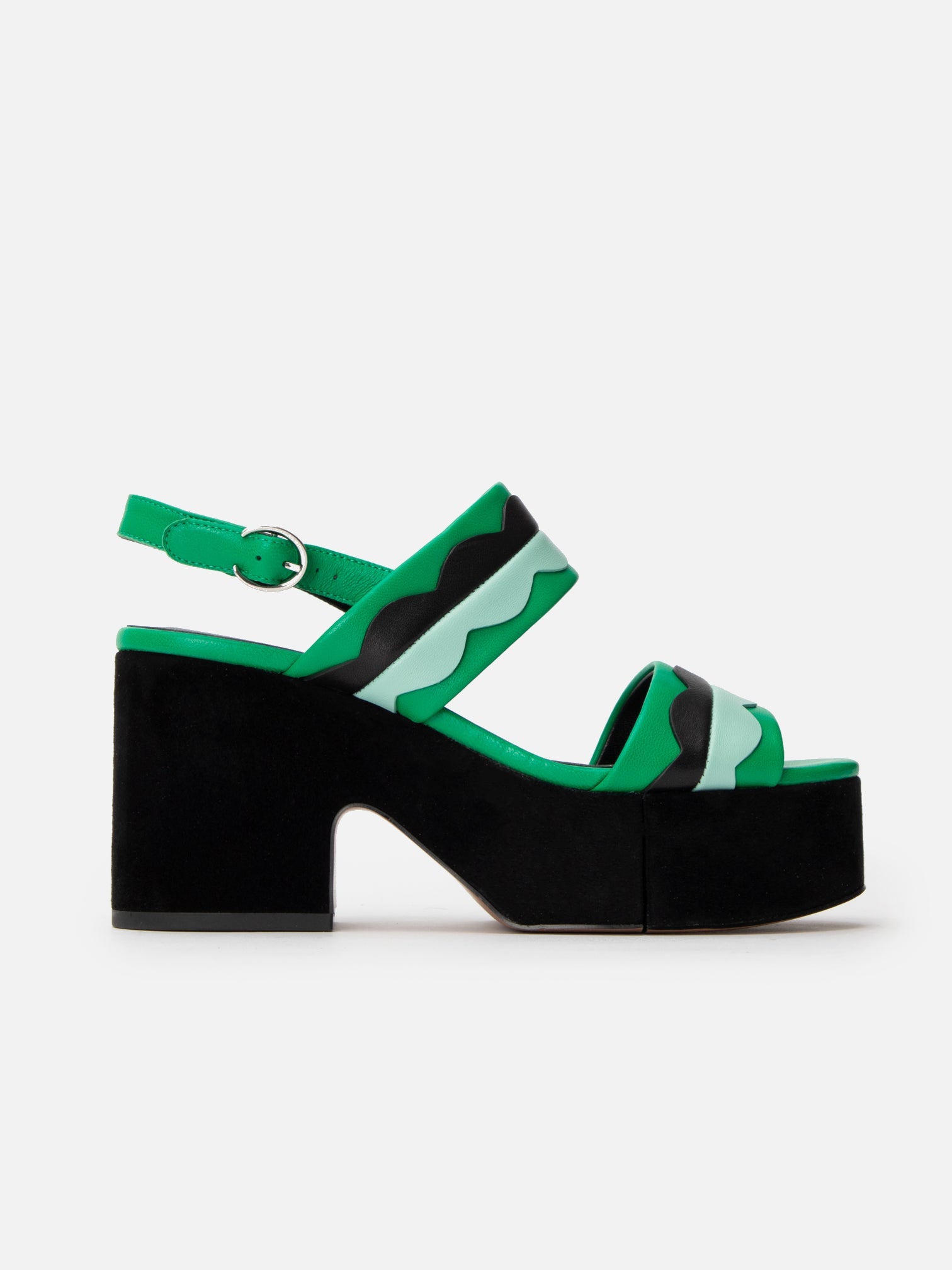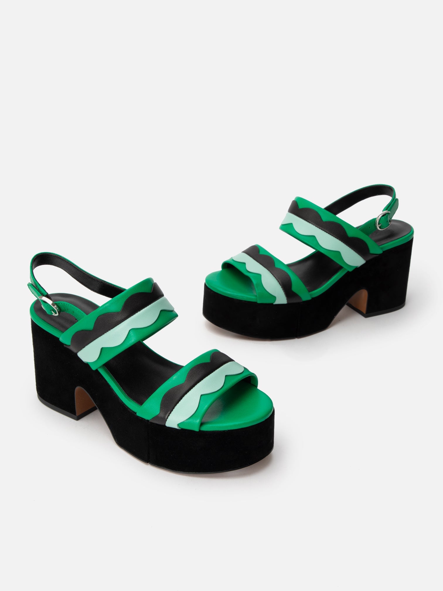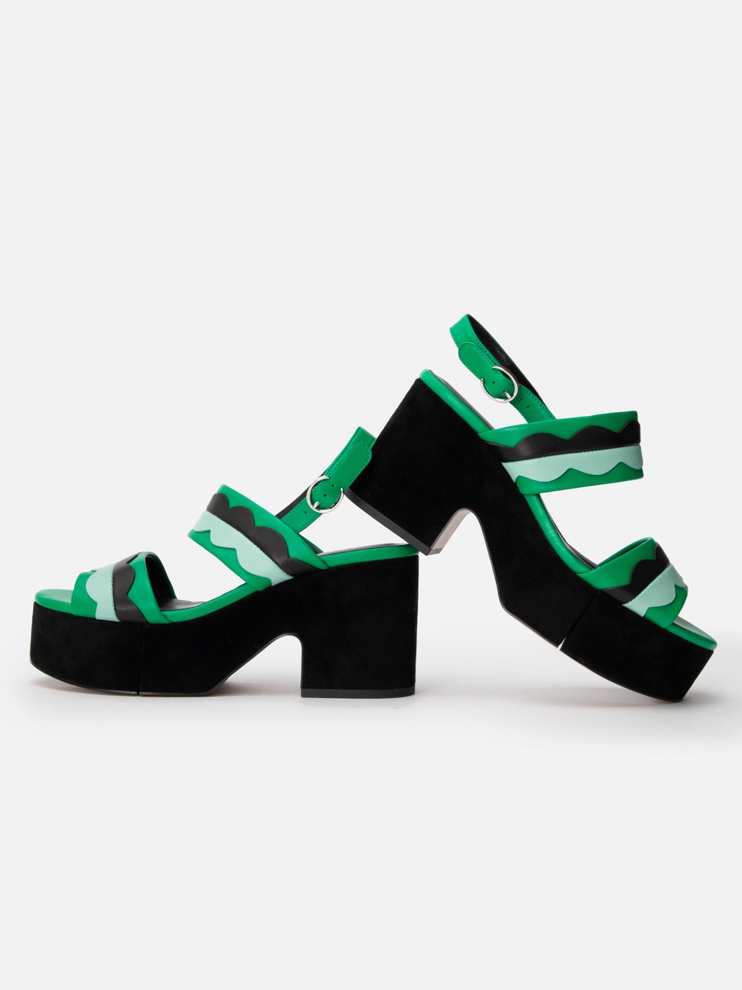 Upper: Lucky lambskin, cool lambskin, black lambskin / Lining: Black goatskin / Sole: Black suede goatskin covered platform, arizona sole, black edge