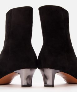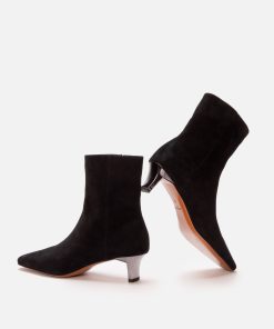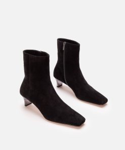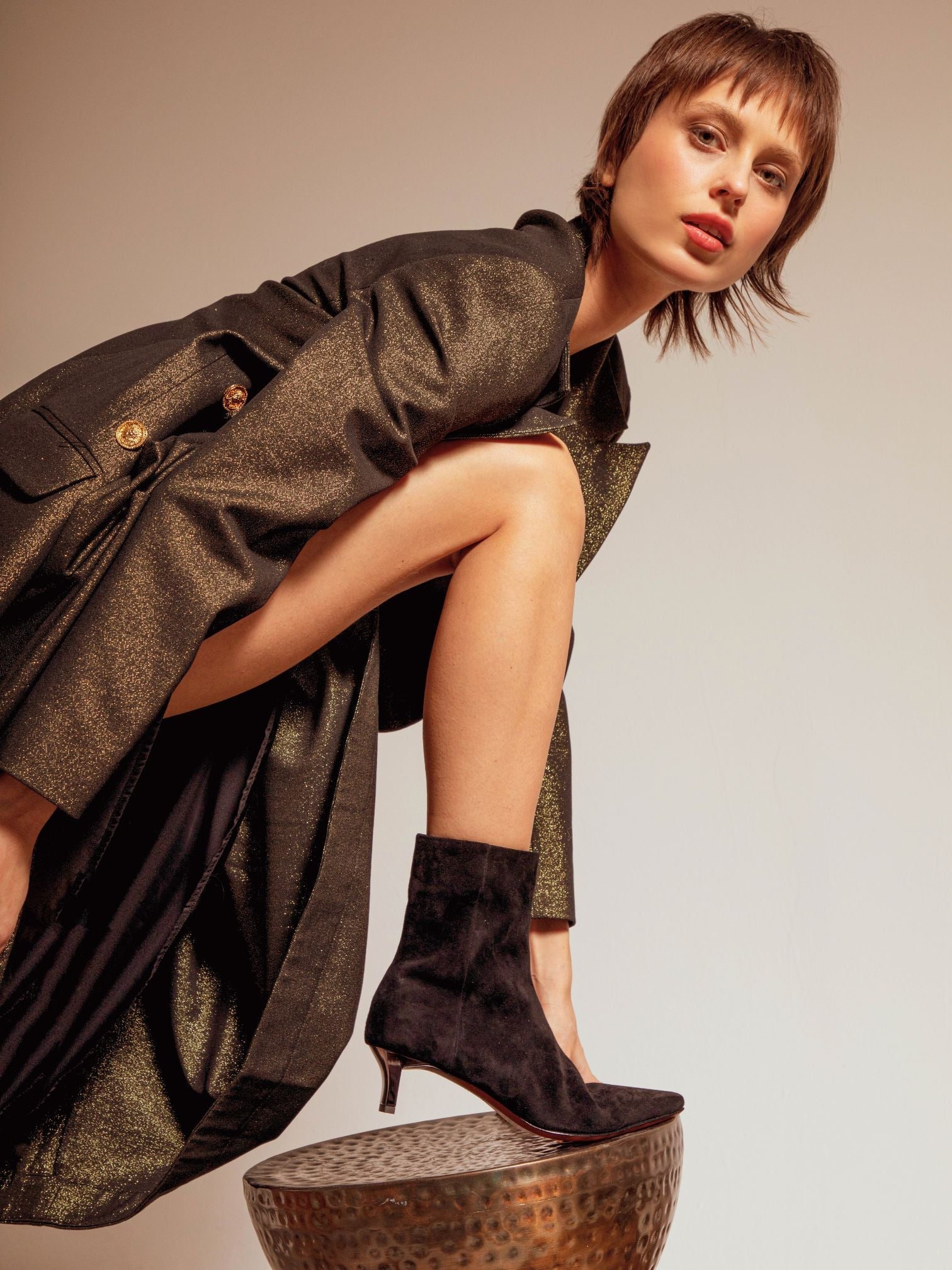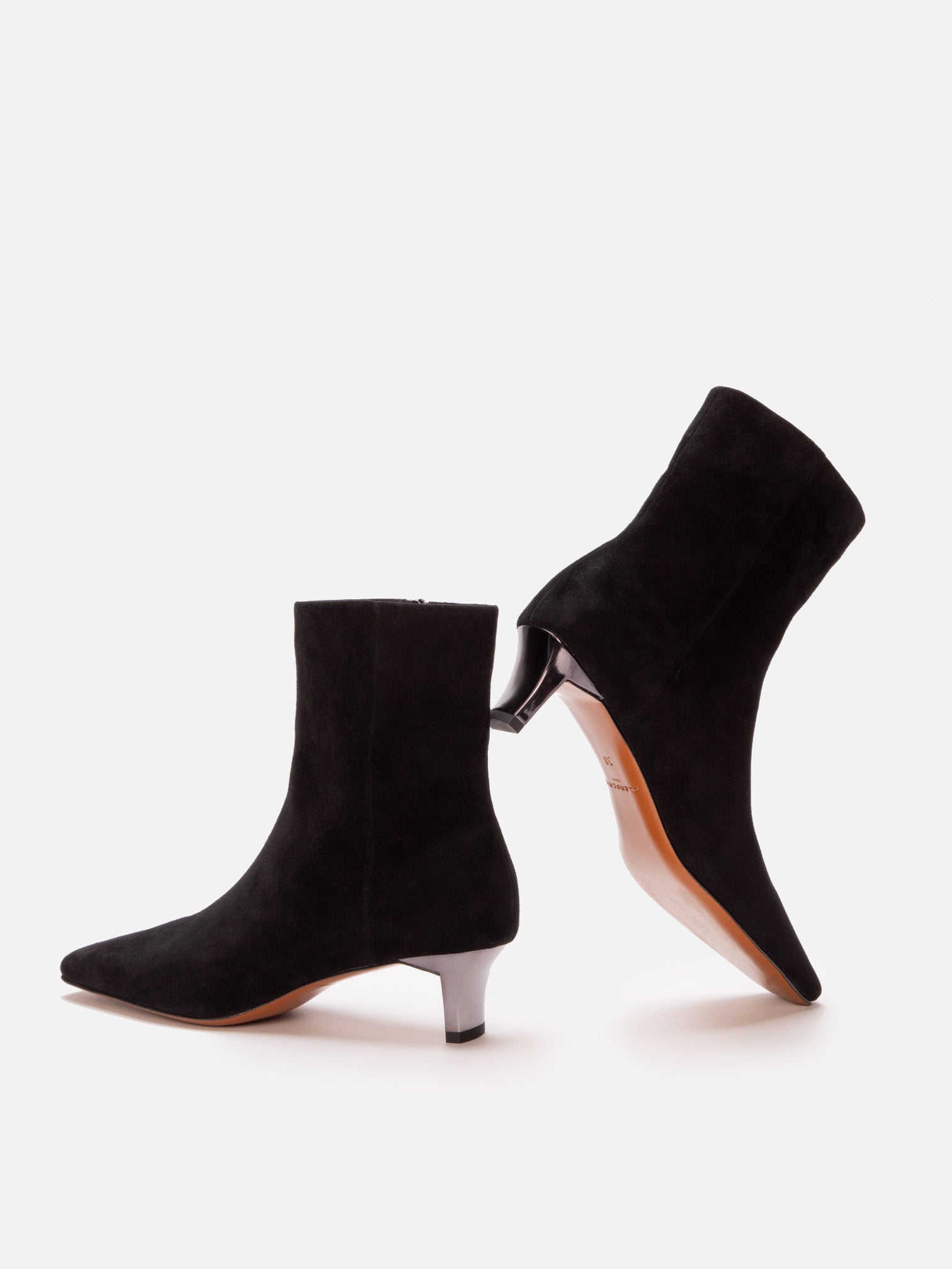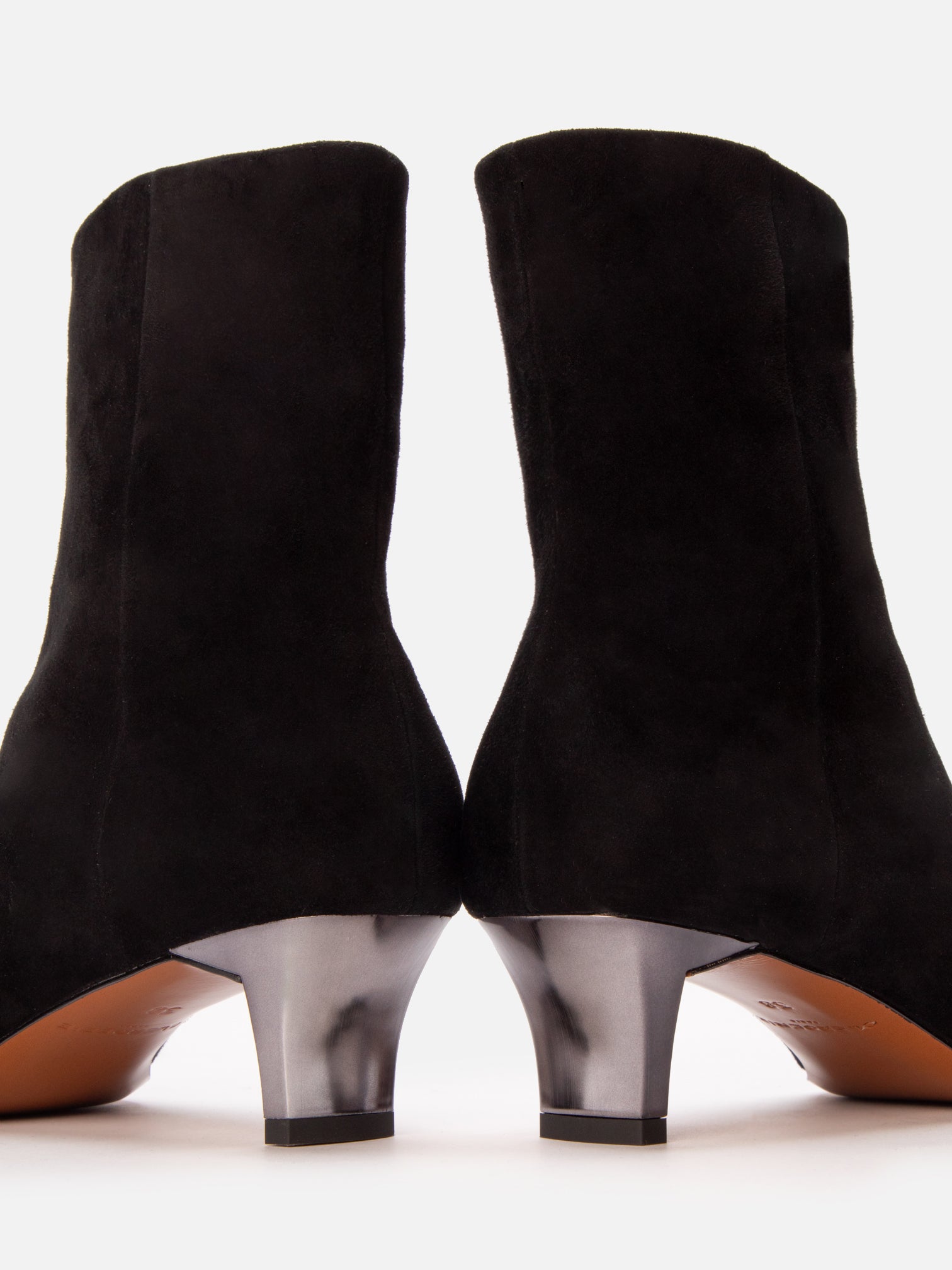 Upper: black suede goatskin / Lining: black goatskin lining / Sole: brushed gunmetal heel, amber leather sole, black edge